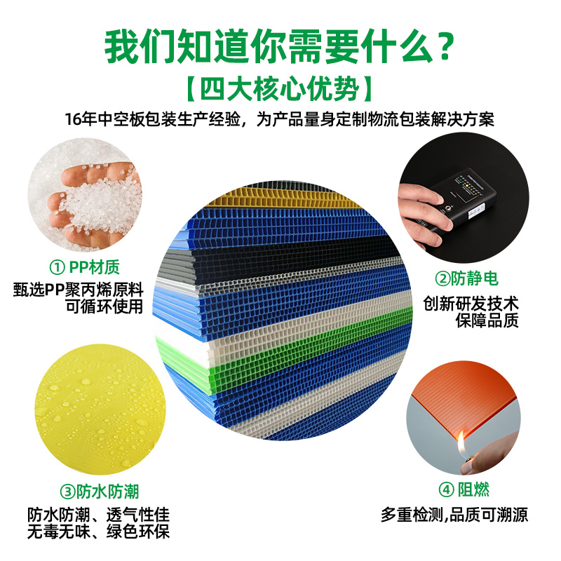 中空板颜色多样,防水防腐,可防静电阻燃,多色印刷。